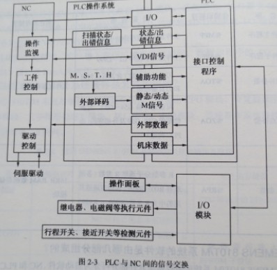????SIEMENS 810T/M“系統(tǒng)自帶一個(gè)集成式PLC,用于實(shí)現(xiàn)系統(tǒng)與機(jī)床的接口和電氣邏輯控制。集成式PLC就是數(shù)控裝置沒有單獨(dú)的PLC的CPU,硬件上與NC不能分離,不屬于某型號的PLC與NC實(shí)現(xiàn)接口或者通信而構(gòu)成系統(tǒng)的模式.編程語言采用SIEMENS SIMATIC S5系列PLC的語言STEPS. PLC與NC間的信號交換如圖2-3所示。